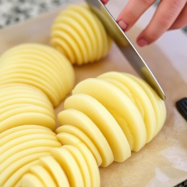 Set your oven to 400°F (200°C). Grab your potatoes and slice them accordion-style. Basically, you make little cuts down one side (not all the way through), flip, then slice the other direction. It’s weirdly satisfying — just take your time so you don’t go all the way through. - Make the garlic butter.