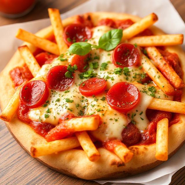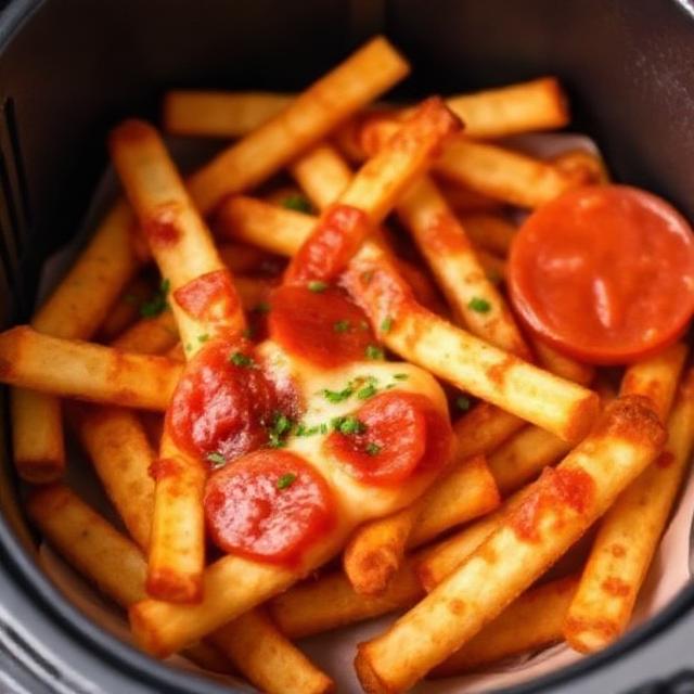 Let the air fryer do the heavy lifting. Cook the fries until beautifully crisp—edges golden, centers fluffy. Transfer them to a heatproof dish or keep them in the basket with parchment. Spoon pizza sauce over the hot fries, scatter mozzarella generously, and tuck in pepperoni or your favorite toppings. Slide the basket back in for just 1–3 minutes so the cheese melts into a stretchy, bubbly blanket. Finish with Parmesan and basil. That’s it—cheesy bliss in minutes.
