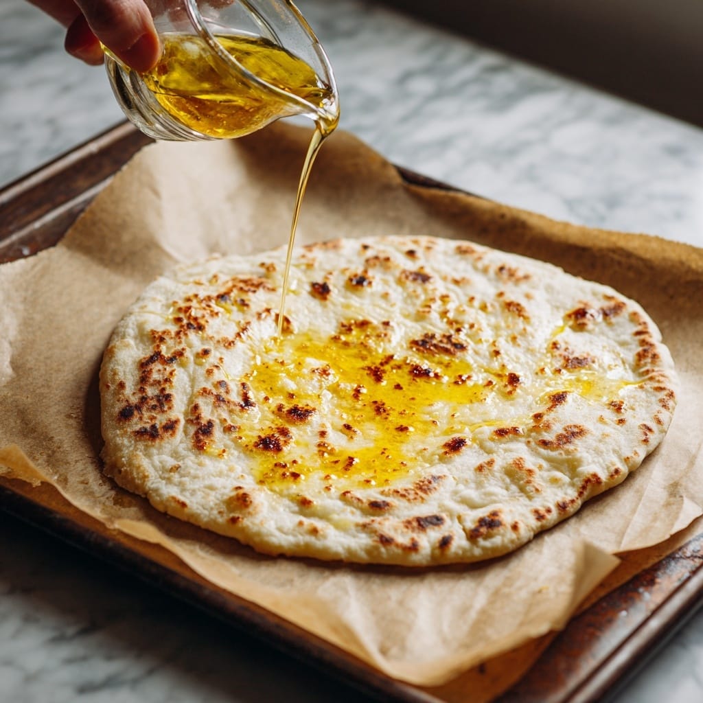 Set the oven’s temperature to 400°F, or 200°C. Put your flatbread on a parchment paper-lined baking sheet and drizzle it with a little olive oil, just enough to give it a little sheen.
