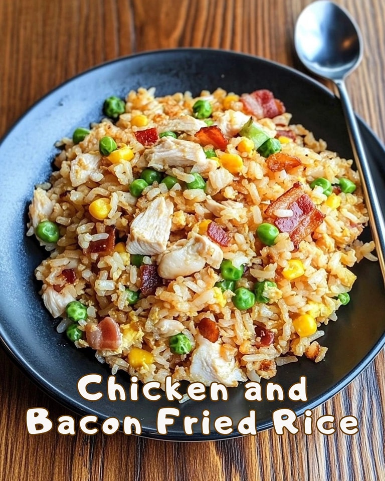 Drizzle in the soy sauce and sesame oil. Stir-fry for about 5 minutes until the rice is evenly coated, slightly crispy, and golden in spots. - Mix in the chicken, bacon, and peas:
