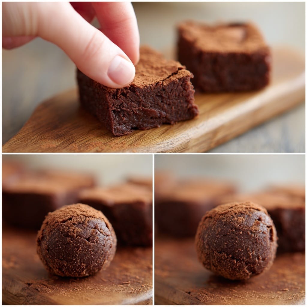 Cut the cooled brownies into squares, around 2 inches each. Take one square and flatten it gently in your hand. Place a cookie dough ball in the middle and wrap the brownie around it. It might crack a little — that’s fine. Just pinch the edges closed. Repeat until all your little bites are made. Chill them for 10 minutes to firm up.