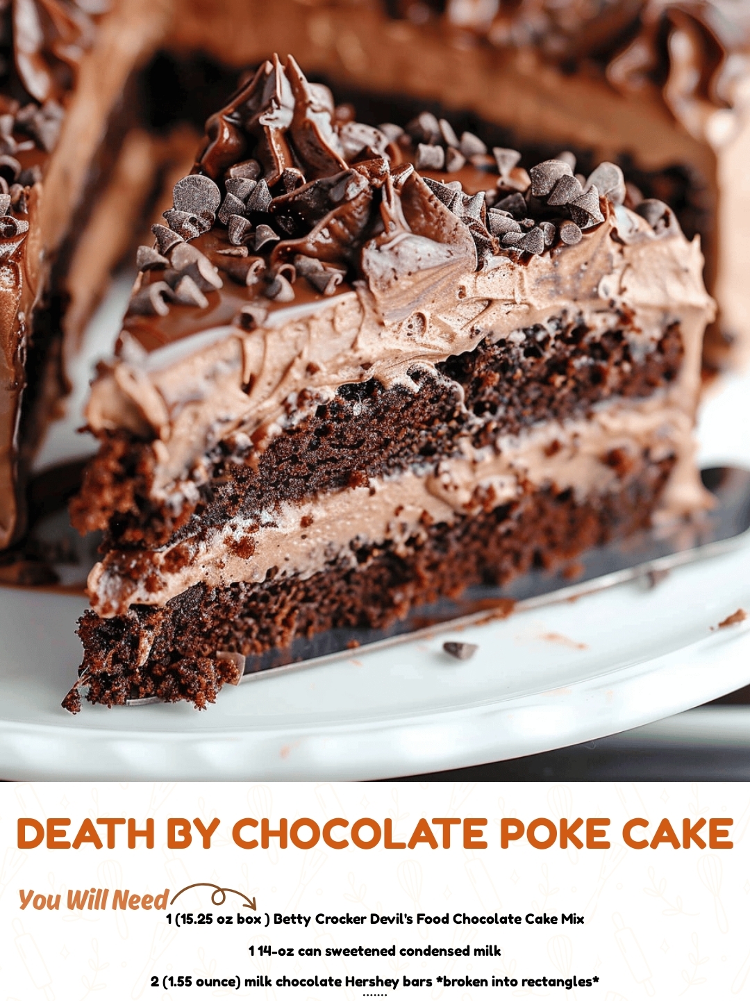 So preheat that oven, grab your favorite mixing bowl, and prepare to meet your new guilty pleasure. The Death by Chocolate Poke Cake isn’t just dessert — it’s an experience, a celebration of all things sweet, rich, and utterly unforgettable. One slice, and you’ll understand why it’s called “Death by Chocolate” — because after this, there’s simply no going back.