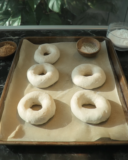 Knead until it pushes back softly when you poke it. Let it rise under a towel until puffy. Divide it, roll each piece into a rope, and loop it into a ring—don’t stress about perfect circles.