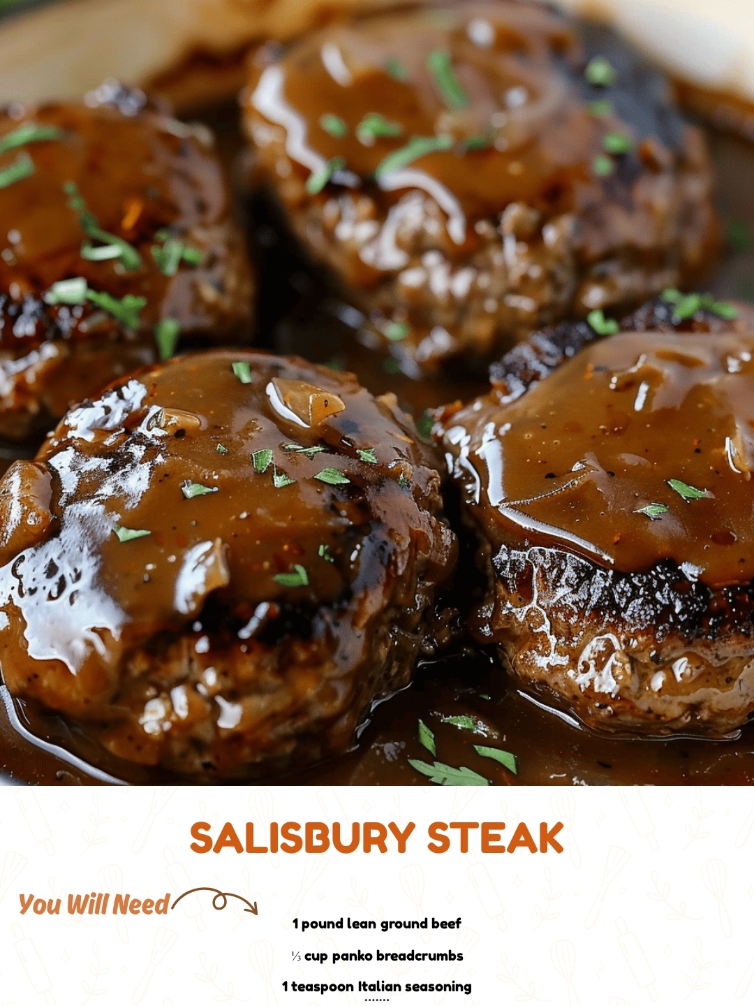 • Serve your comforting Salisbury steaks over mashed potatoes, topped with gravy, and sprinkle with black pepper and parsley. Try this hearty dish today Discover more comforting recipes to bring joy to your kitchen
