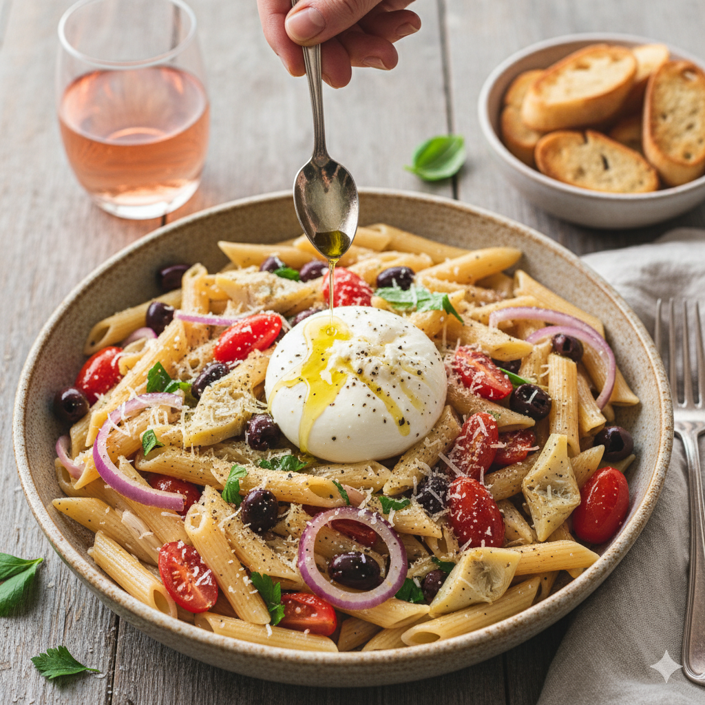 There was a jar of artichoke hearts, half a bag of sun-dried tomatoes, some olives left from a snack plate, and this one beautiful burrata I’d bought “for later.” I didn’t even have a plan — I just boiled some pasta, threw everything into a pan with olive oil, garlic, and lemon, and hoped for the best. And somehow… it came together in the most perfect way.