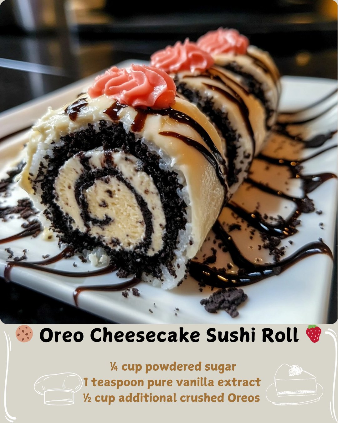 Once rolled, chilled, and sliced, the Oreo Cheesecake Sushi Roll reveals its stunning cross-section — swirls of dark cookie, white cheesecake, and vibrant fruit, each piece looking like a miniature work of edible art. It’s an eye-catching dessert that’s sure to impress guests but requires no baking, no complicated techniques, and minimal ingredients.