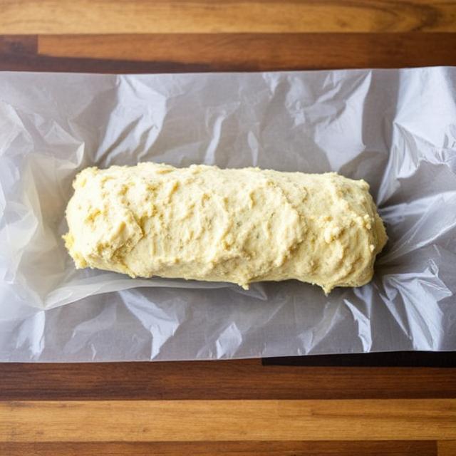 Scoop it onto a piece of plastic wrap and shape it into a log. It doesn’t have to be perfect — just make sure it’s kind of even. Wrap it up tight and stick it in the fridge for at least a couple of hours, or overnight if you’re doing this ahead of time.