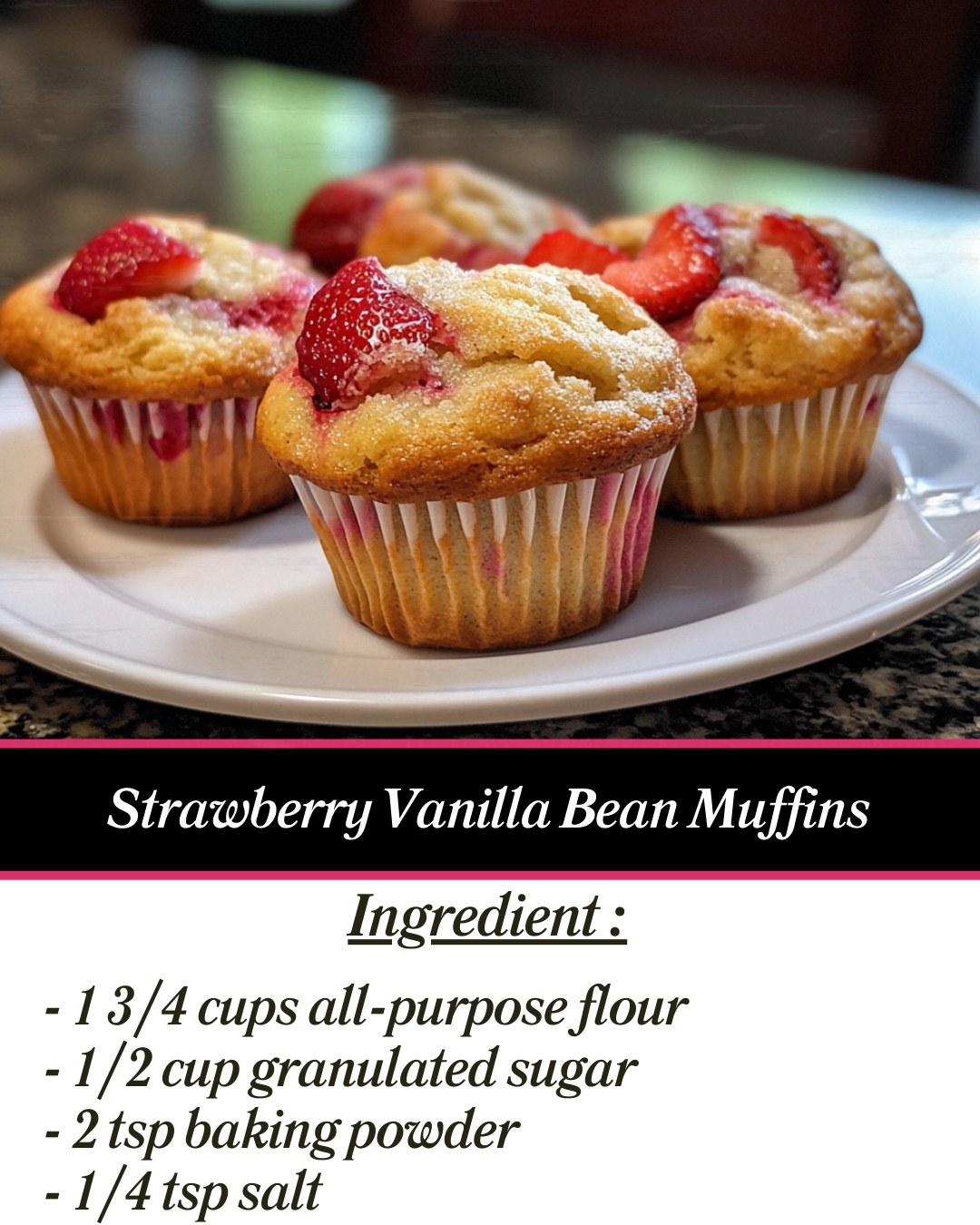 Indulge in the delightful combination of sweet strawberries and fragrant vanilla bean in these moist and fluffy muffins!